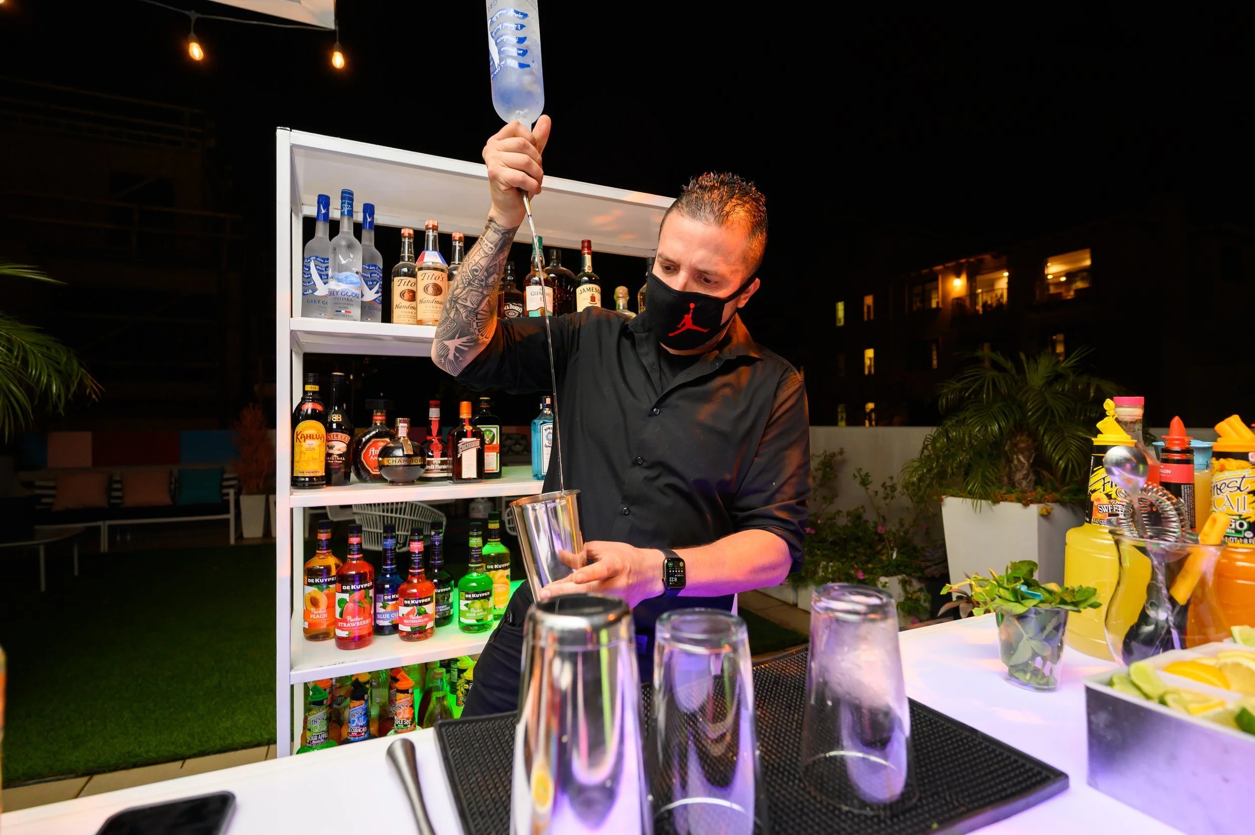 High tables from Create Event Design were illuminated in a variety of muted-neon hues that matched the ceiling-to-floor posters of models donning the new line. In contrast, a clean white bar – manned by Crystal Bartenders – with black-font branding across the front offered a full bar for attendees, whilst the wall behind boasted couches with colorful throw pillows. A punchy lighting design was used to give the floor and grass areas some extra pizazz – something I always recommend because lighting is typically easy to work into a budget and makes for an impactful element.