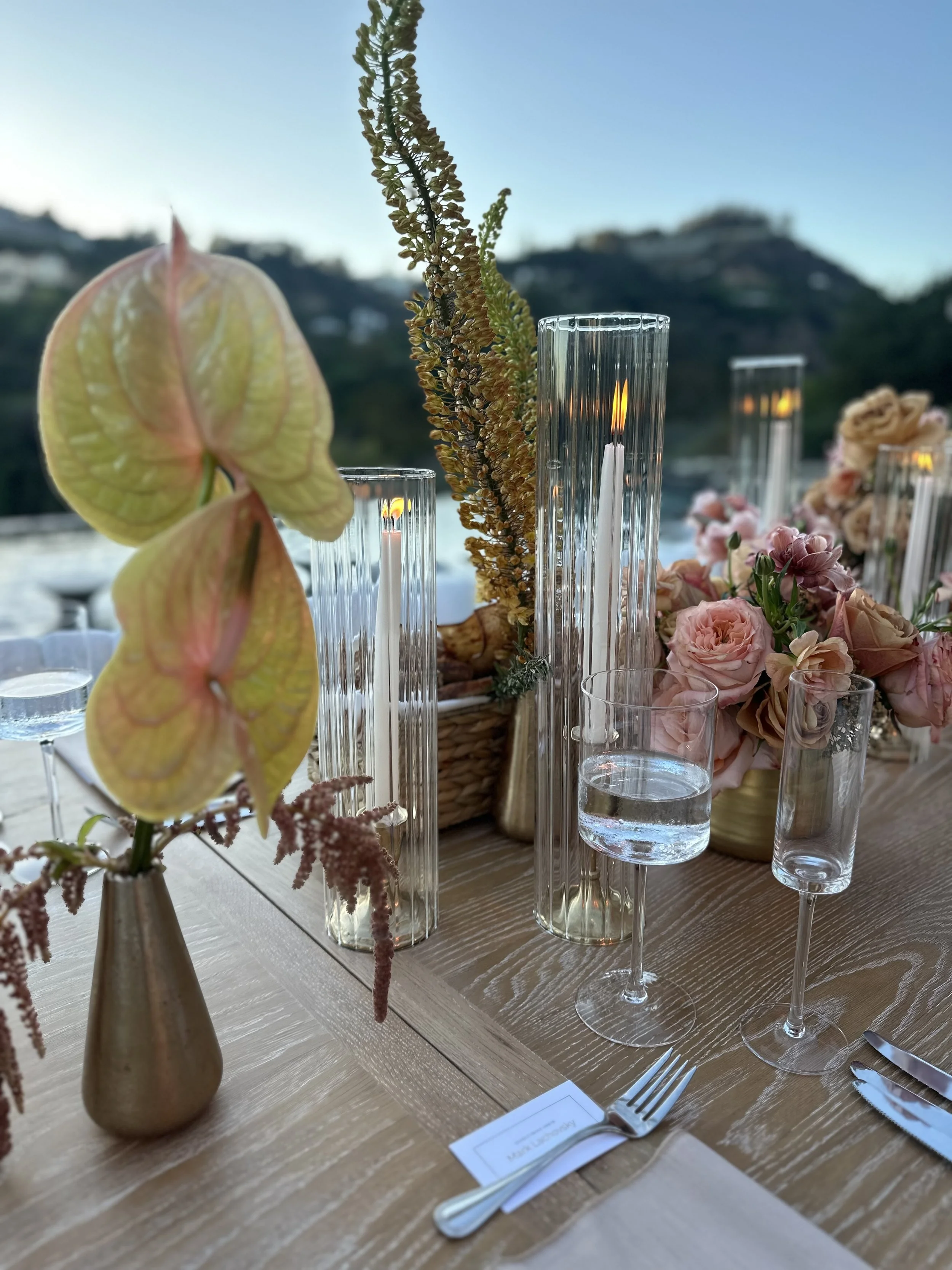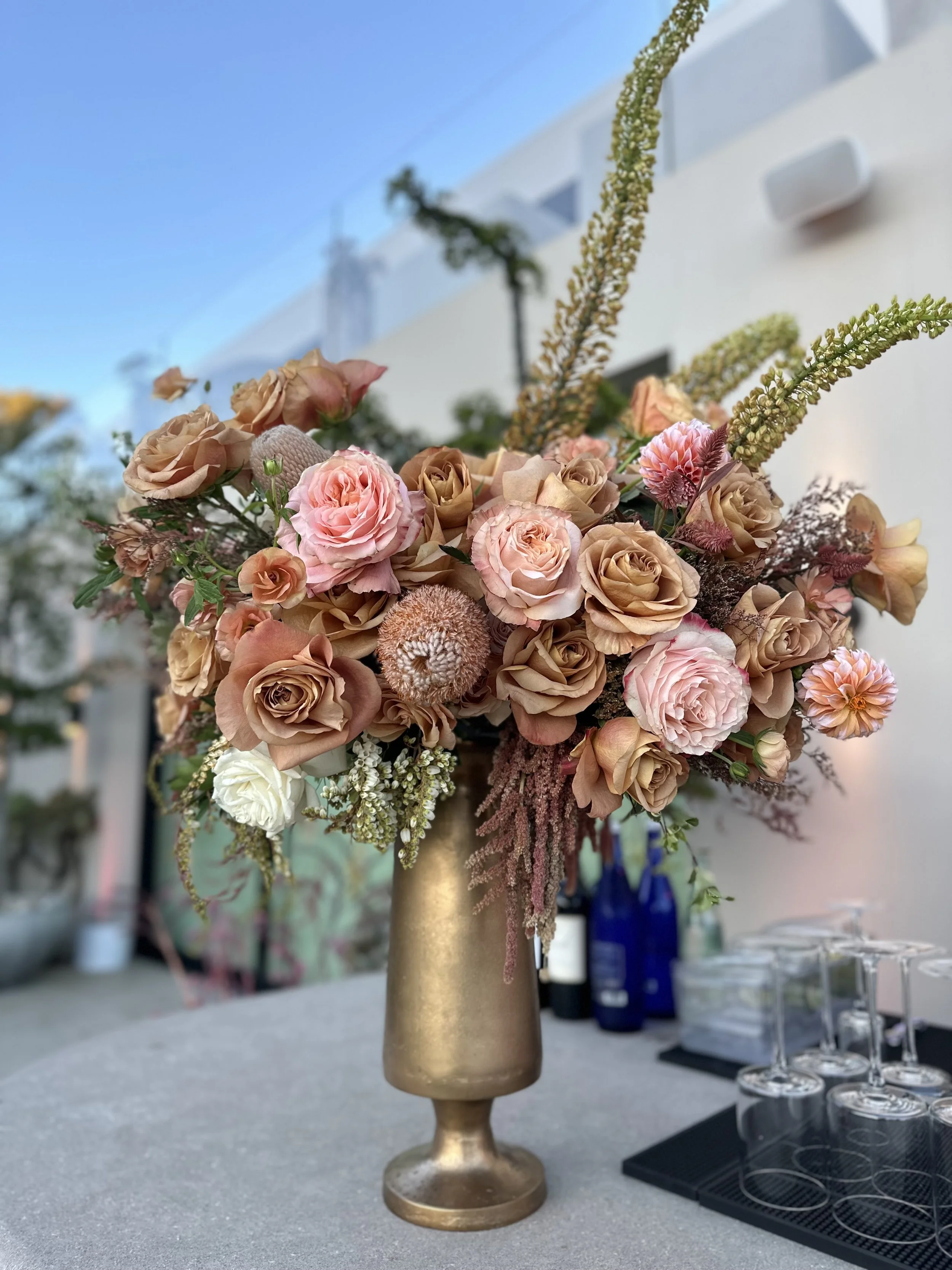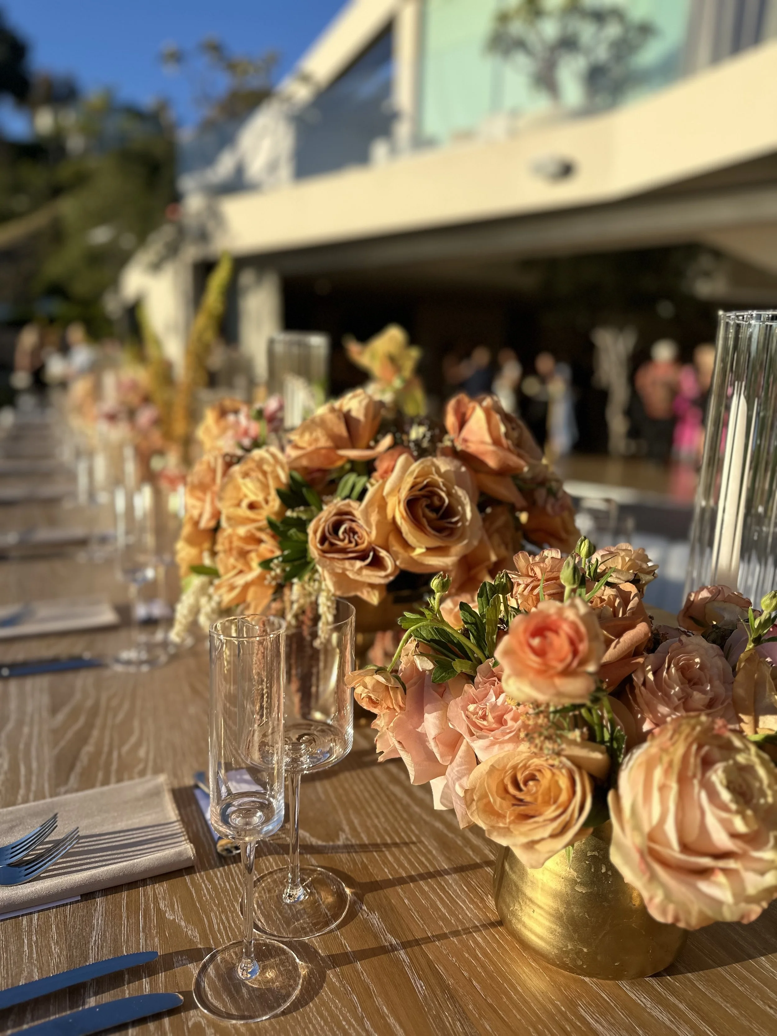 The setting unfolded outdoors, with sculptural floral arrangements in warm palettes of blush, caramel, and soft neutrals anchoring long tables dressed in natural wood finishes. Gold vessels, layered candlelight, and thoughtful tabletop styling created an atmosphere that felt refined yet inviting. Each element was chosen to complement the intimacy of the evening rather than distract from it.