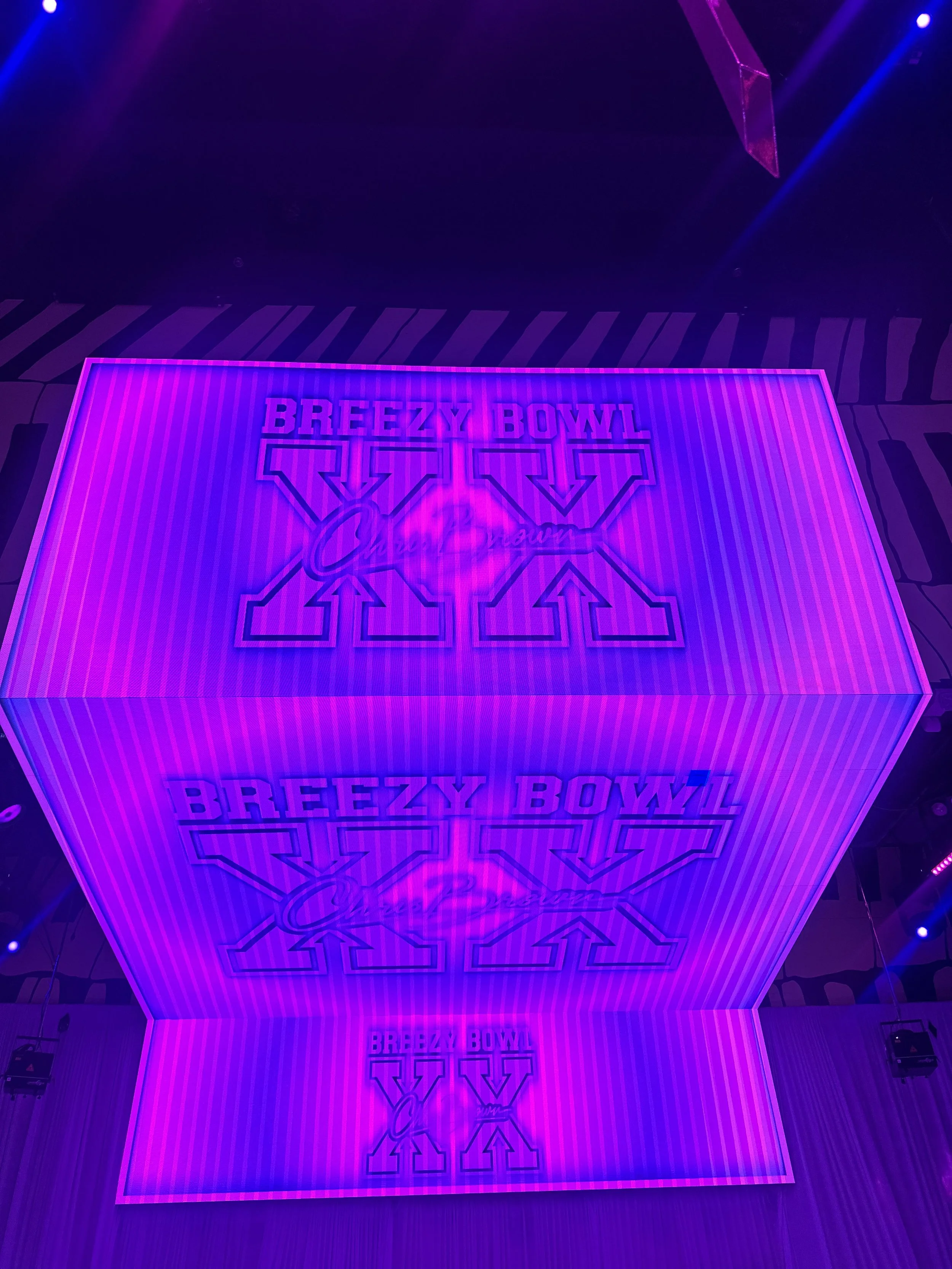 Suspended overhead, a custom, multi-sided LED cube anchored the room, displaying Breezy Bowl XX branding in bold scale. The cube didn’t just brand the event; it became the visual heartbeat of the space, visible from every vantage point and reflected through layered lighting design. The stage backdrop was wow-worthy and performance-ready.