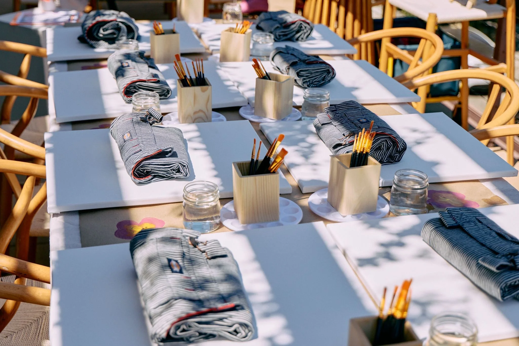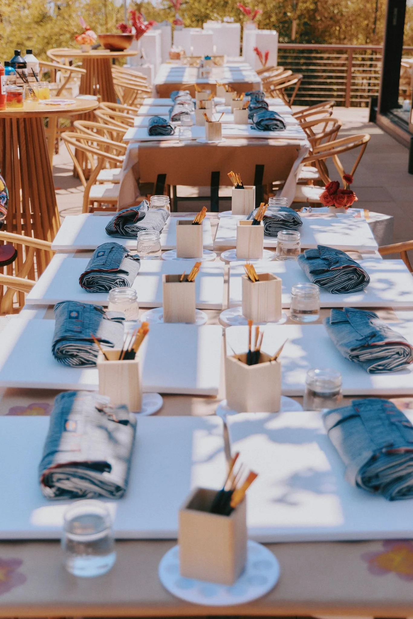 The Wife of the Party partnered with H.E.R. and her creative team to design and fully produce the event, ensuring every element supported her vision. Long communal tables were lined with canvases, jars of paintbrushes, and fresh palettes of color, each place setting completed with striped aprons ready for guests to dive in. The atmosphere was relaxed but elevated, blending the intimacy of a creative workshop with the styling of a high-end celebration.