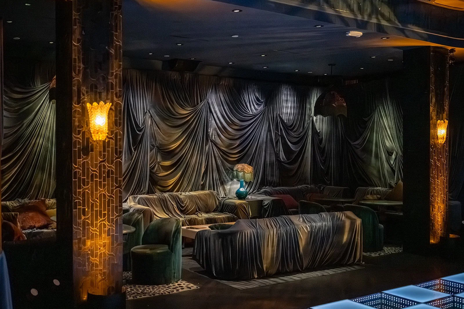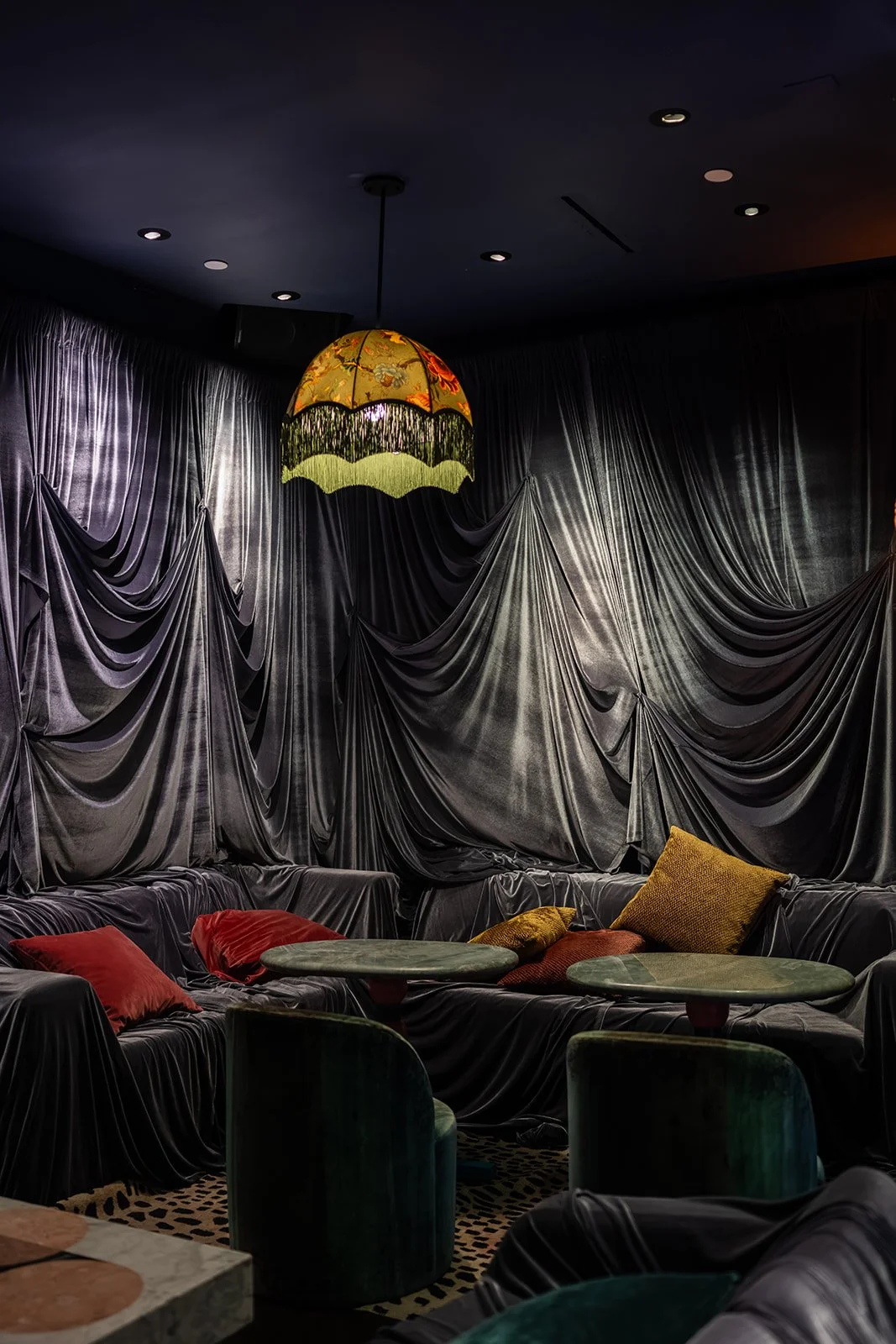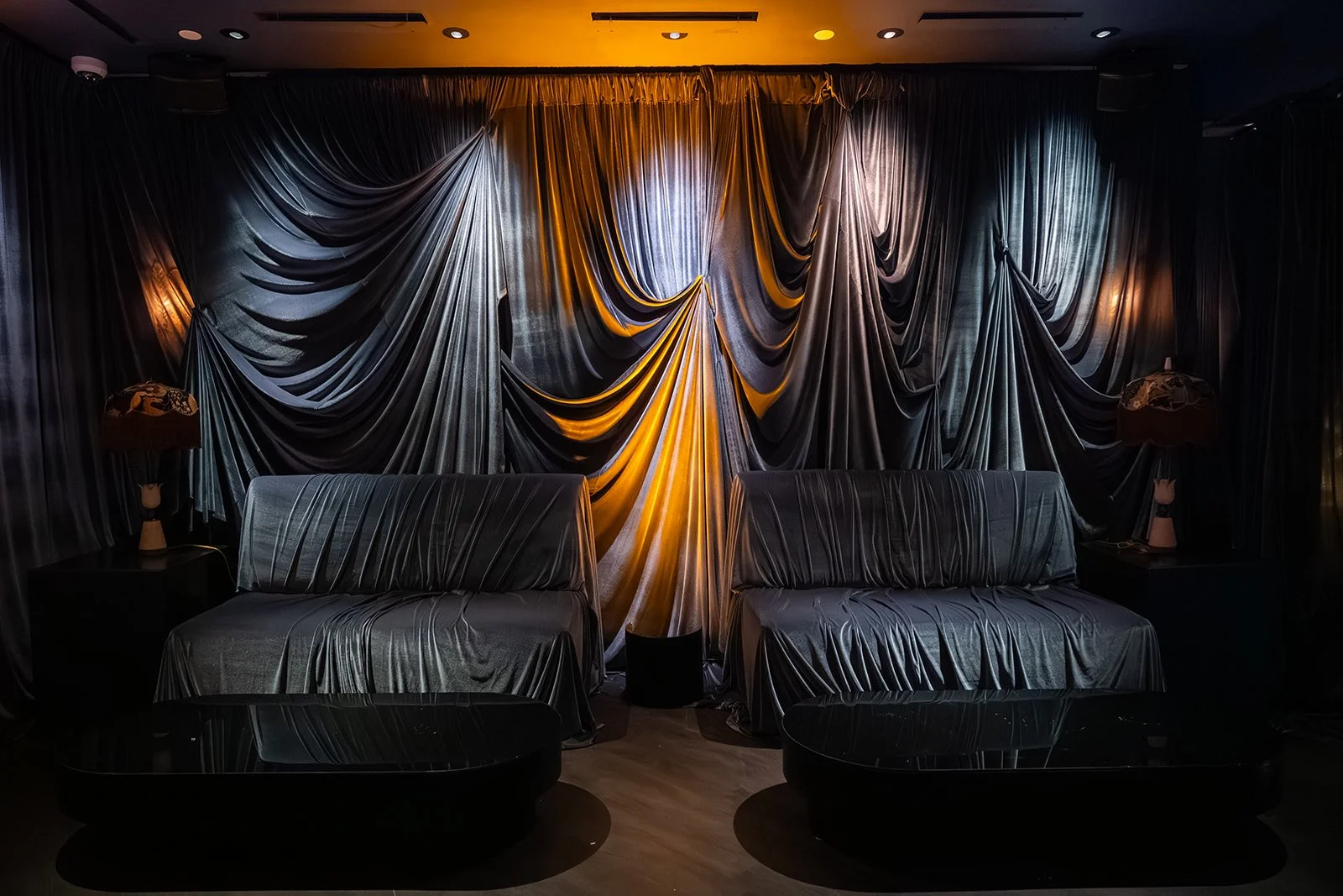 The foundation of the transformation began with custom fabric draping, installed floor to ceiling. Luxe textiles created instant warmth and elegance, allowing the space to feel intimate and completely removed from its everyday identity. Draping doesn’t just decorate; it reshapes how a room is experienced, and here it set the tone for everything that followed.