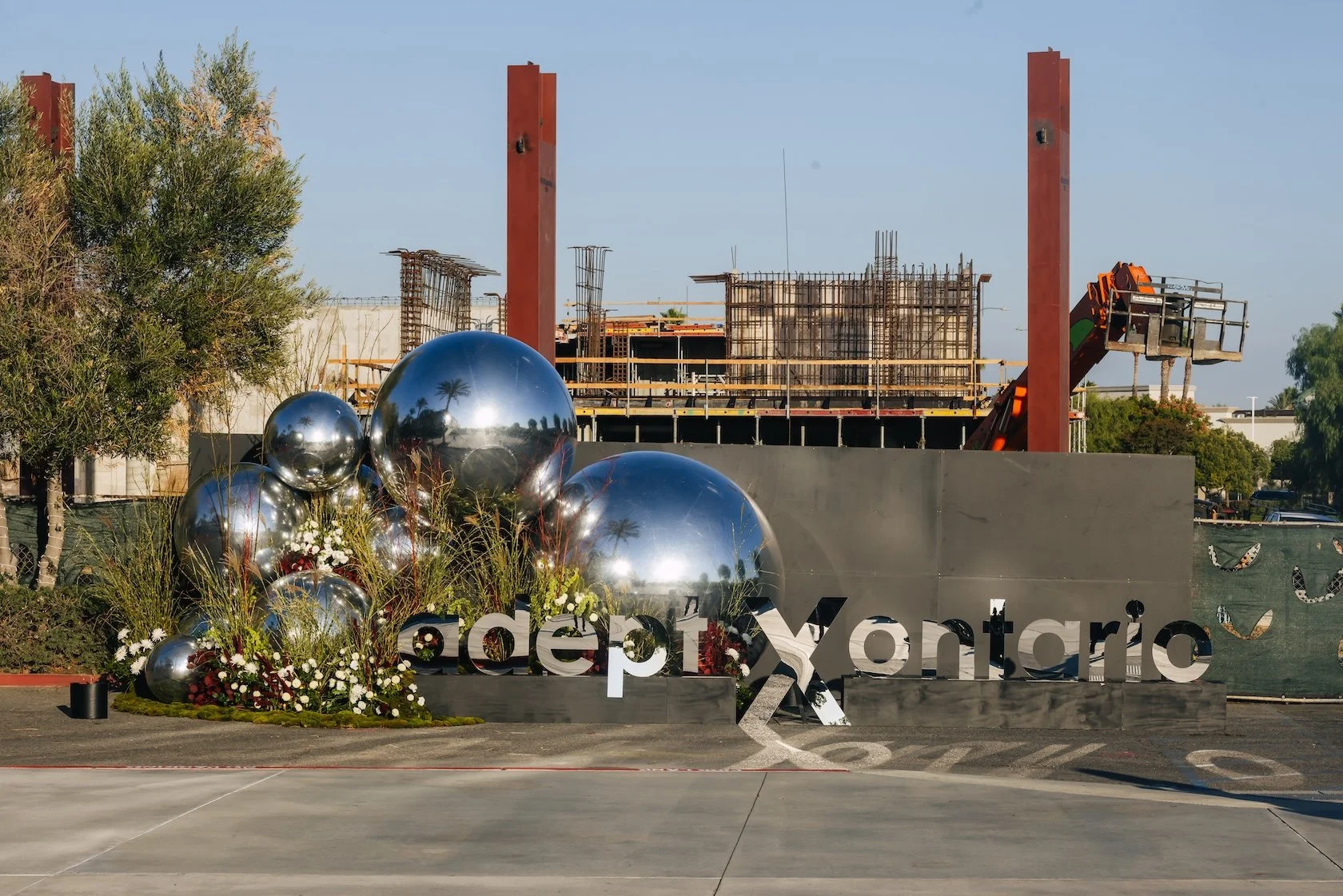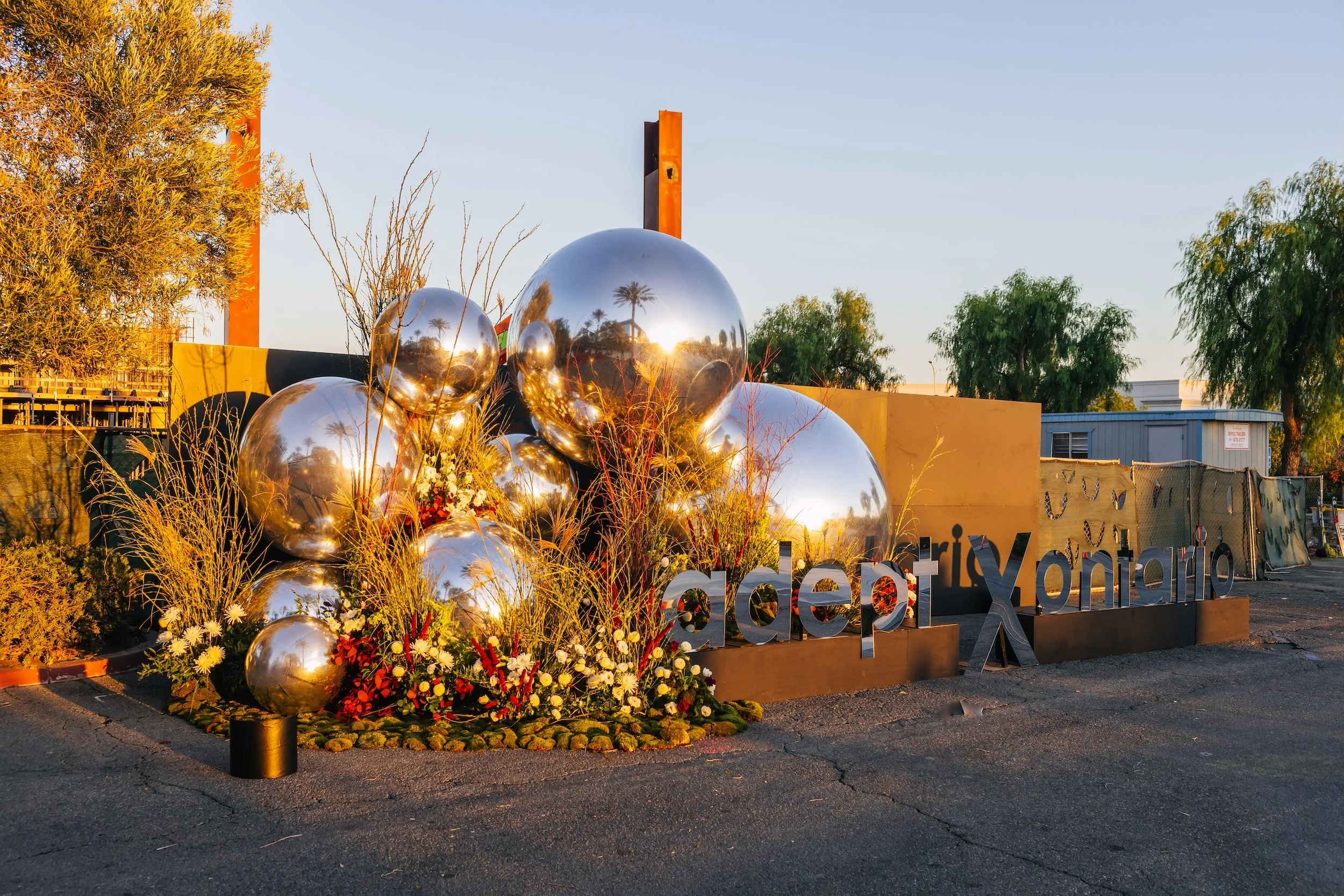 Guests arrived to a powerful visual statement: massive chrome spheres rising from a sculpted landscape of modern florals, grasses, and bold red-and-white blooms. The installation framed the mirrored “adept × ontario” signage, catching reflections of the palm trees and skyline as the sun shifted throughout the evening. This single focal point set the tone: architectural, dramatic, and distinctly contemporary.