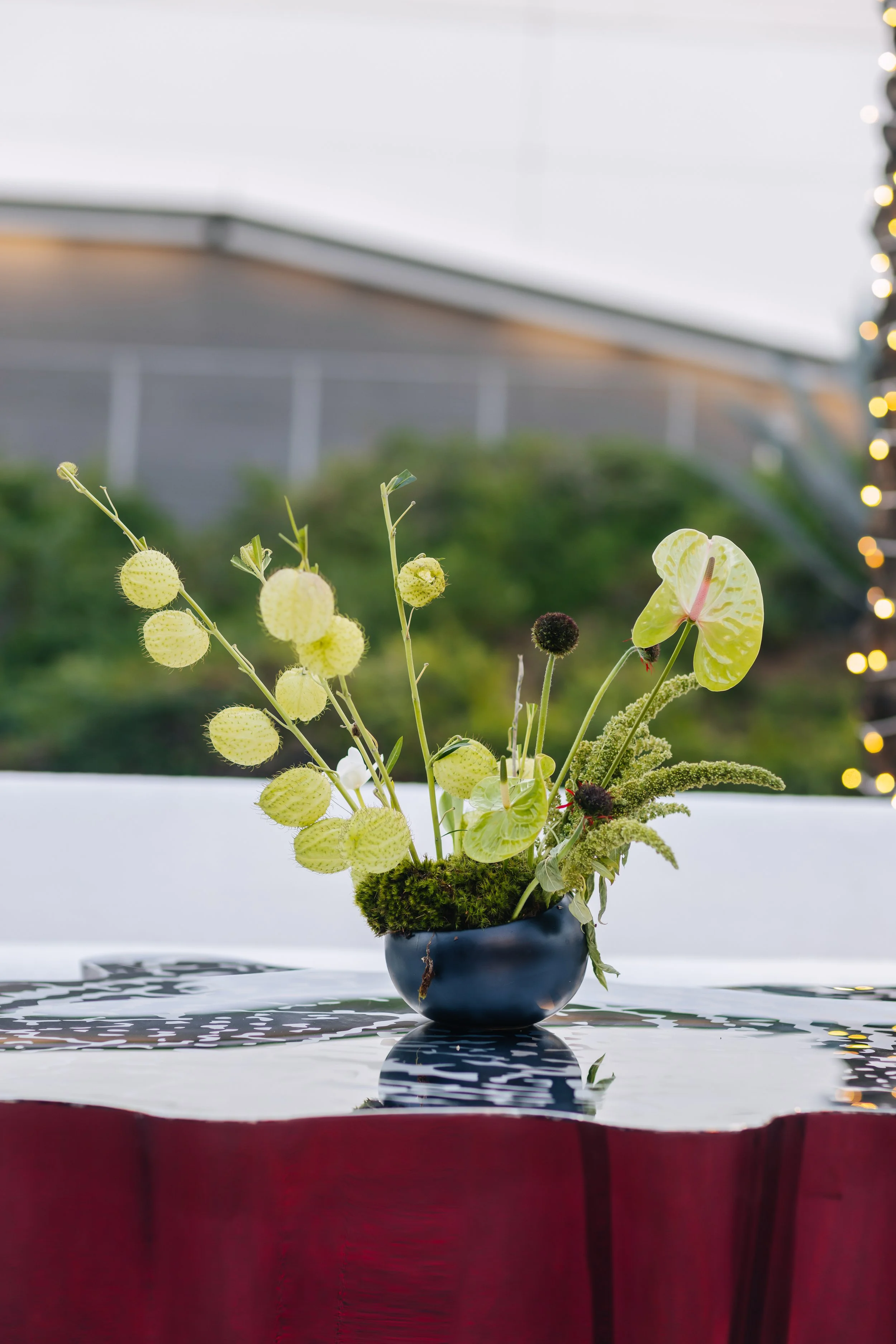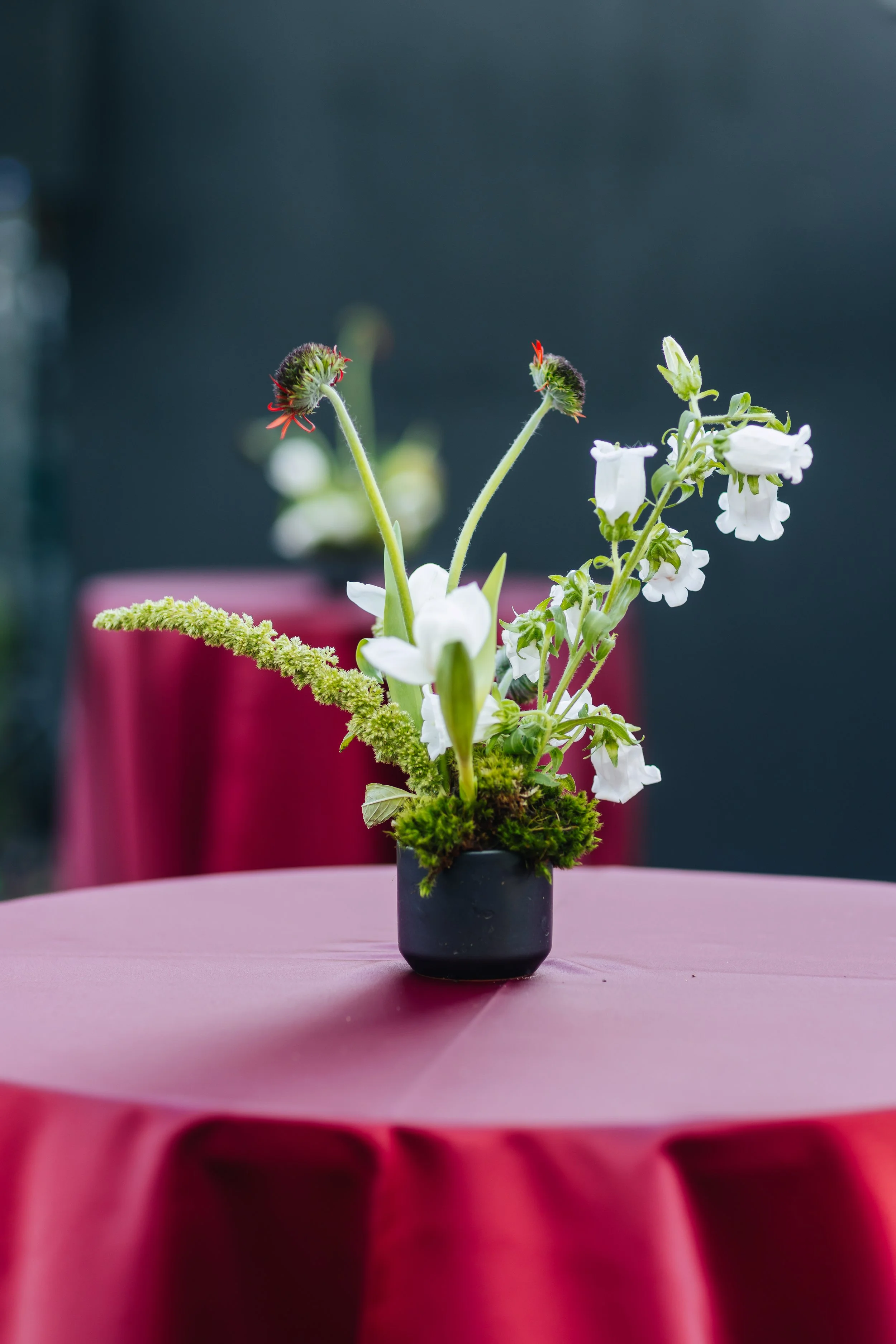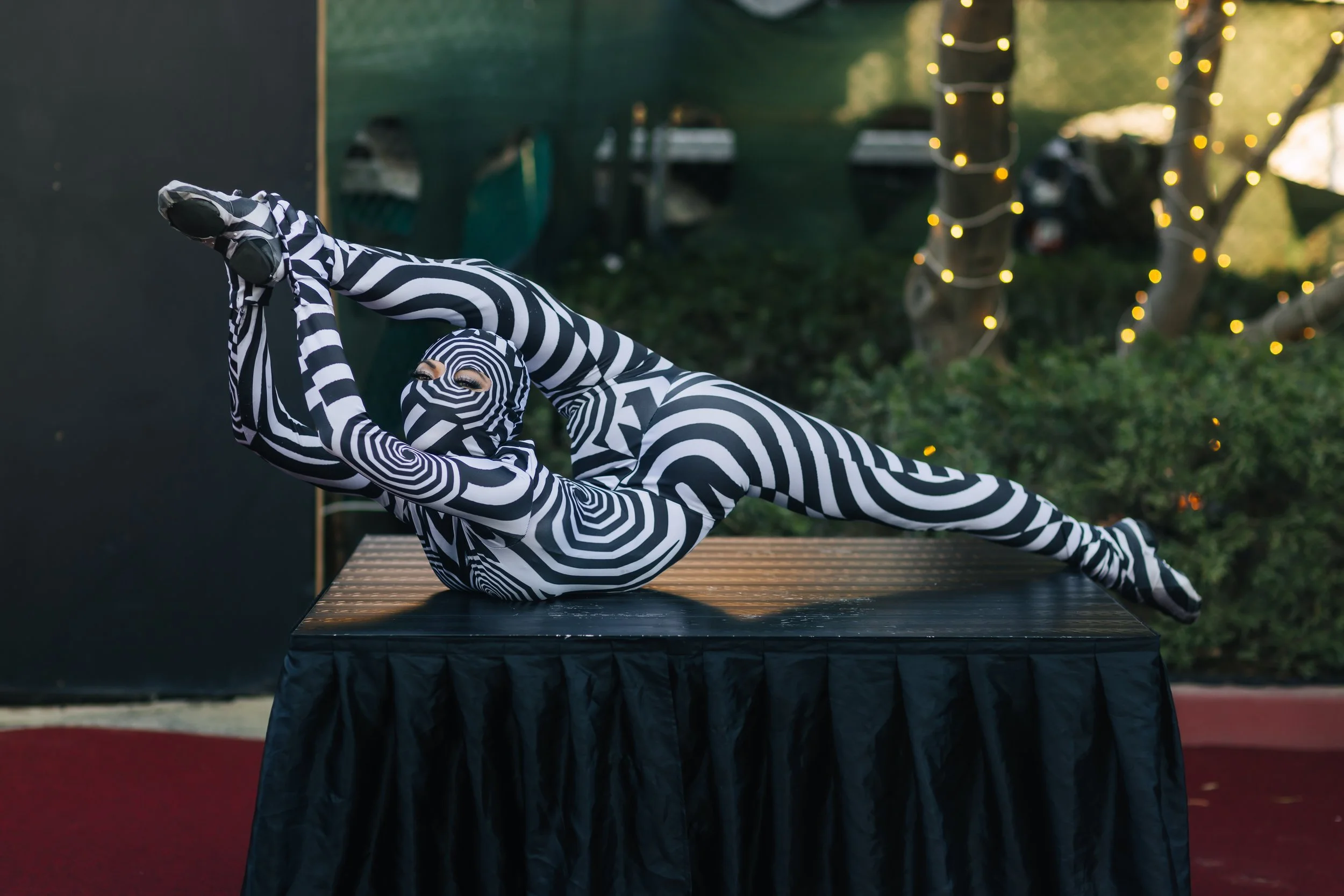 Cocktail areas featured deep burgundy linens and sculptural micro-arrangements in matte black vessels. These floral moments — airy, textural, and modern — offered just enough design to elevate the environment without competing with the large-scale installations. Guests mingled as contortionists in hypnotic black-and-white patterned bodysuits performed atop elevated platforms, adding an unexpected, artistic layer to the evening.