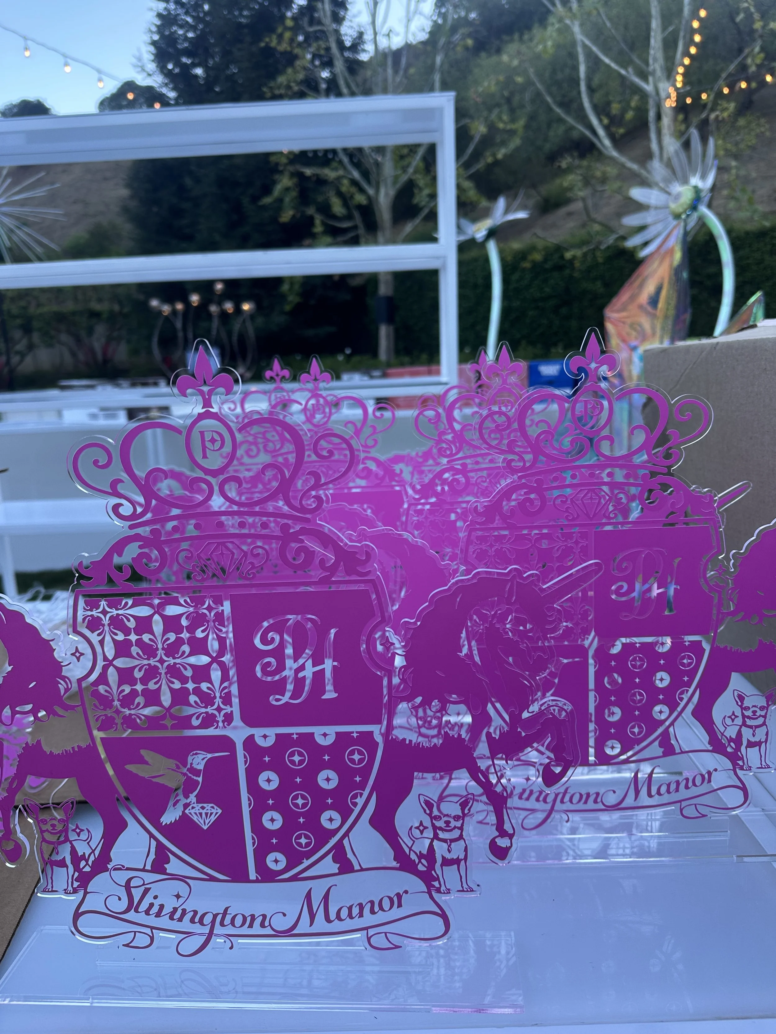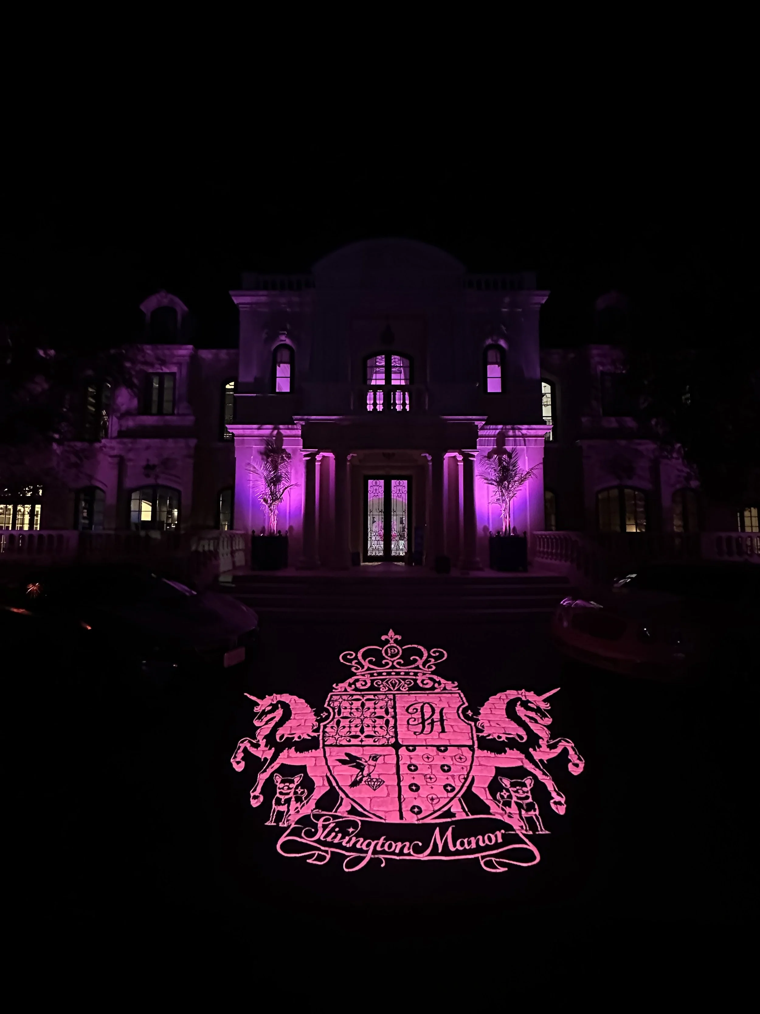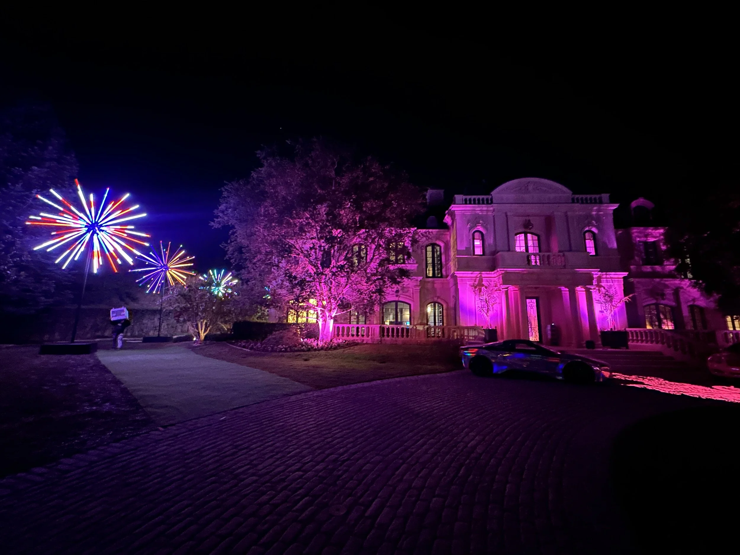 From the moment celebrity guests and loved ones arrived, the property shimmered with energy. Towering LED starbursts lined the pathways, glowing in shades of magenta, violet, and electric blue as guests wandered through the sprawling manicured garden of the estate. The lawn of “Slivington Manor” itself pulsed with color, illuminated by waves of light that shifted with the music: a surreal, dreamlike effect that made guests feel as if they were walking through a technicolor art exhibit.