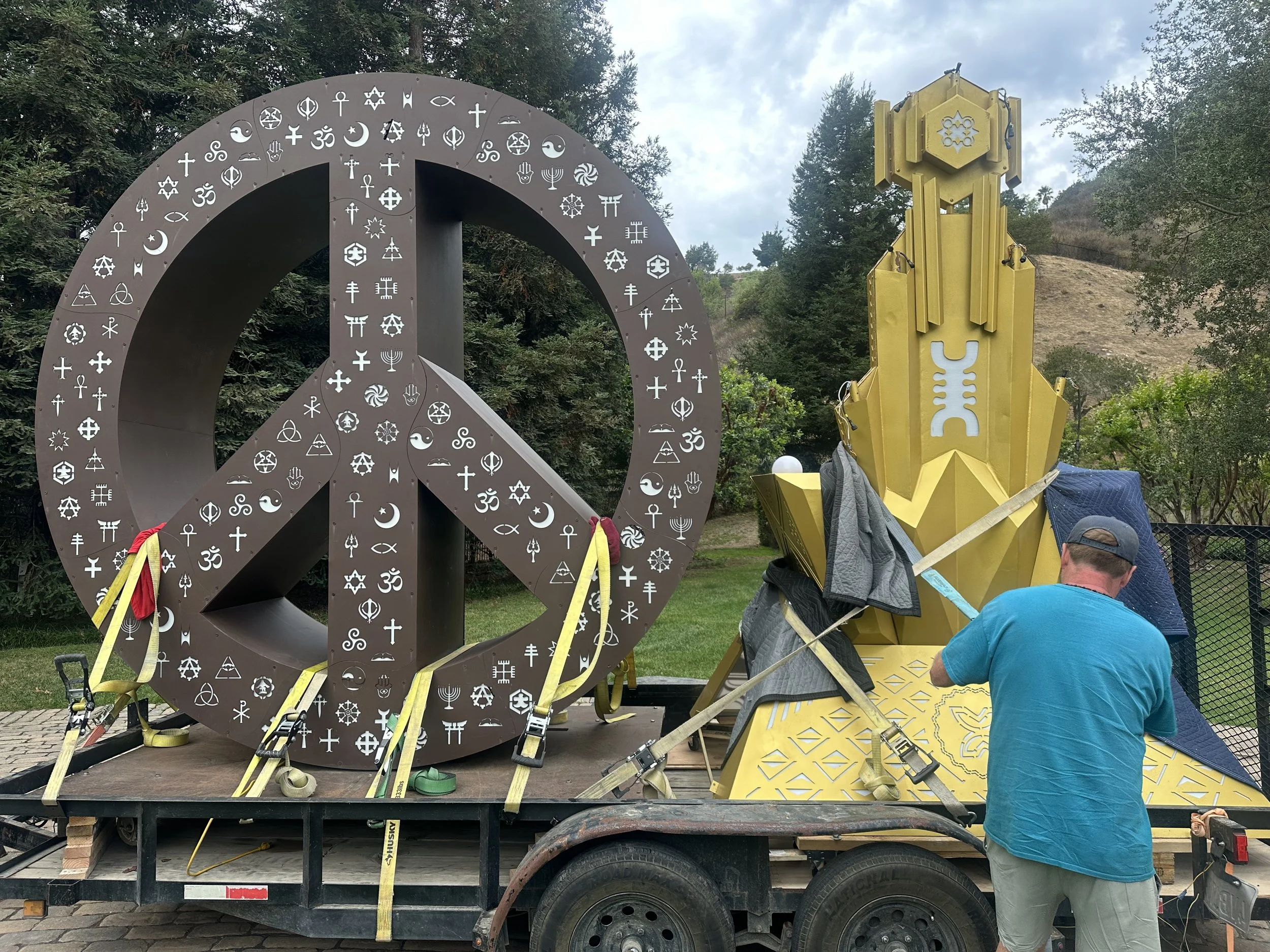 In true festival fashion, massive sculptural pieces were brought in to anchor the experience — including a giant peace sign adorned with spiritual symbols and a gold geometric installation that paid homage to the creative spirit of Burning Man. Each piece was positioned and secured with precision, requiring cranes, trailers, and teams of fabricators and installers working in sync for days leading up to the party.